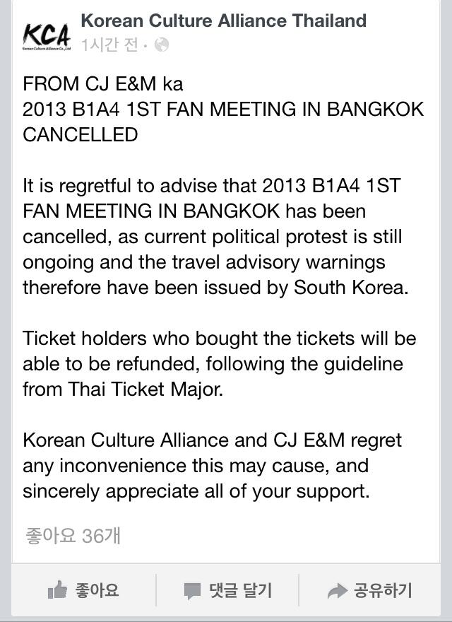 [資訊] 131206 '2013 B1A4 1st Fan Meeting in Bangkok' 取消